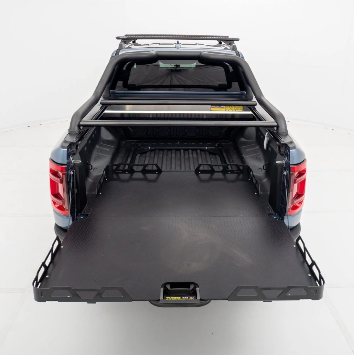 The ultimate solution for easy access and management of your vehicle's tub. The HSP Load Slide is a purpose-built, retractable slide tray featuring a heavy-duty steel frame and a custom-cut platform that contours perfectly to your vehicle, wrapping around the wheel arches for a seamless fit. Operated via a simple handle with multiple latching positions and a dedicated side rail, it’s designed to give you better control over your cargo. Compatible with canopies, it’s the ideal upgrade for convenience, durability, and functionality.