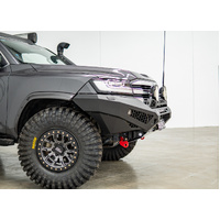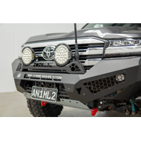 Here is a stylish steel top hoop for your Predator bar on your LC300 with an Offroad Animal Predator bar. This 2 piece Steel hoop not only protects the grill and lights but looks bad ass.  We call it the Rally hoop as it's inspired by the rally cars of old with a pod housing their driving lights.  This one is obviously more functional as it is made from steel to assist in grill protection.  Plenty of speed holes cut in it to so airflow is not blocked to the radiator as well.  Don't stress as it also works with your radar cruise and Autonomous braking