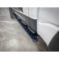 A very innovative design has made these super tough sliders easier to fit than most others. First install the 3 heavy duty steel brackets on chassis, then install our awesome backbone and tread step. The backbone is made from ultra tough 6061 T6 Aluminium extrusion that is designed to be much stronger than any steel section other are using. Being similar in weight and much stronger, it also allows for easy fitment of the steel tread plate step.