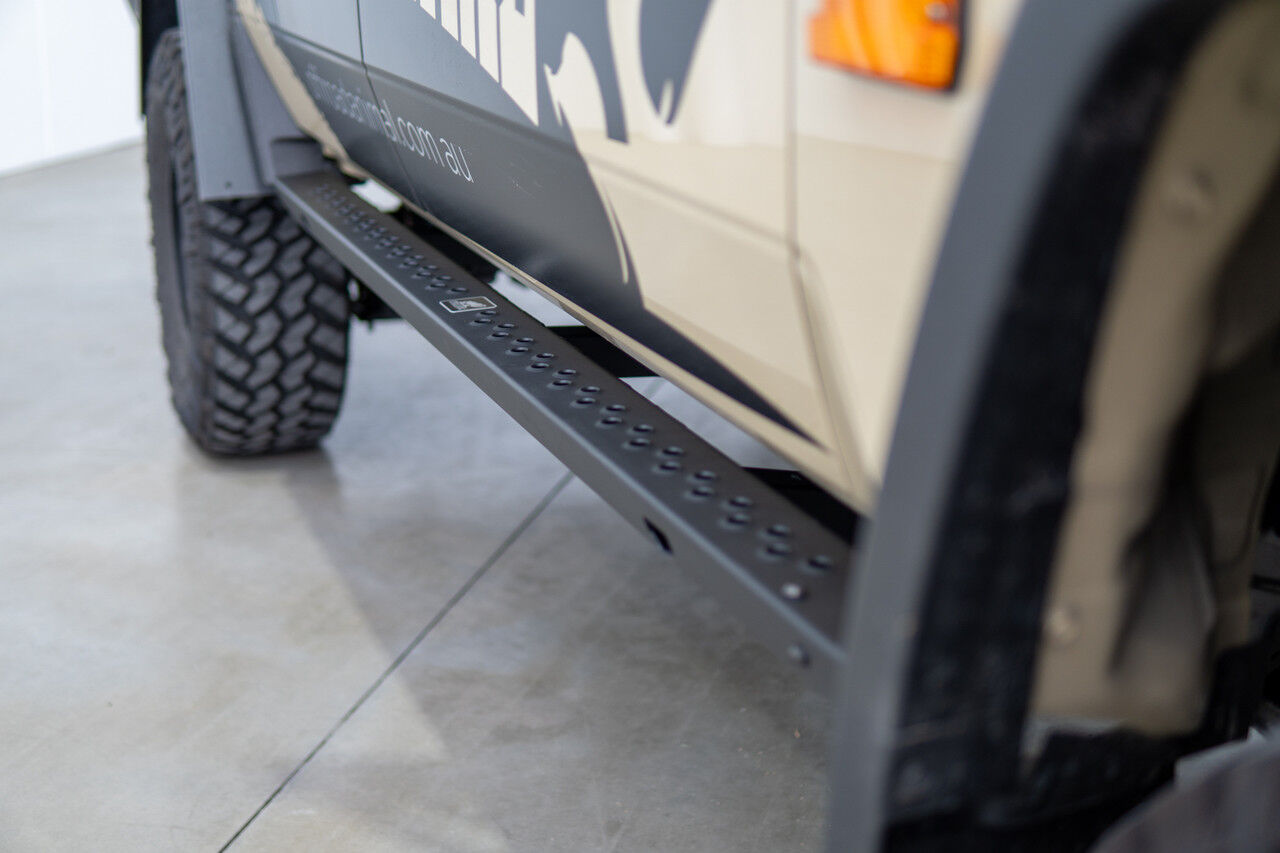 Okay these rock sliders kick arse. I mean seriously look at them. No other comes close. Designed with serious protection in mind as well as stunning good looks, you'll be the envy of all with these bad boys installed. Don't let your vulnerable sills cop a hiding. Ditch those factory piss-weak steps off and install these bad boys for piece of mind protection and great access as a step.